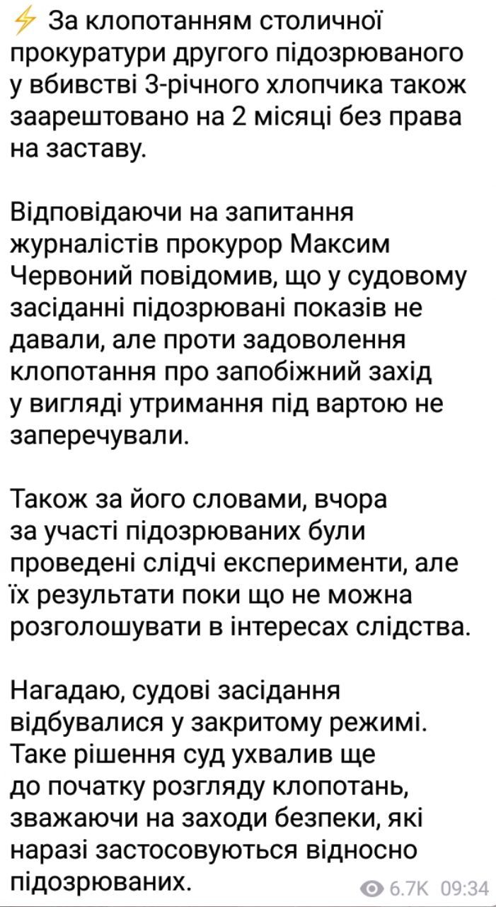 Другого підозрюваного у вбивстві 3-річного Олександра Соболєва, якого розстріляли у машині батька в центрі Києва 1 грудня, за клопотанням столичної прокуратури заарештували на 2 місяці без права на заставу.