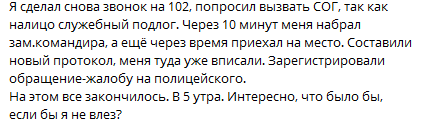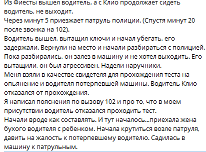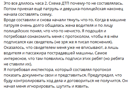 "Це все тривало години 2. Схема ДТП чомусь не складалася. Потім приїхав ще патруль і дівчина-поліцейська нарешті почала складати схему. Начебто склали і знову почали тягнути щось. Коли в машині патруля дуже довго спілкувалася дружина водія та по обличчю поліцейських зрозумів, що щось нечисто. я підійшов і почав вимагати ознайомити мене з протоколом, щоб я в ньому підписався як свідок (не дарма ж я писав пояснення). Виявилося, що свідком мене вже не вписують, а лише водія і пасажира постраждалої машини. Найцікавіше, що там з"явилися підписи цих хлопців (але хлопці не ставили їх)", - повідомив свідок.