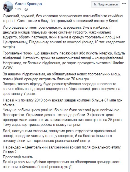 "Сучасний, зручний, без хаотично запаркованних автомобілів і стихійної торгівлі. Саме таким я бачу Центральний залізничний вокзал в Києві", - написав він, показавши фото майбутнього вокзалу.