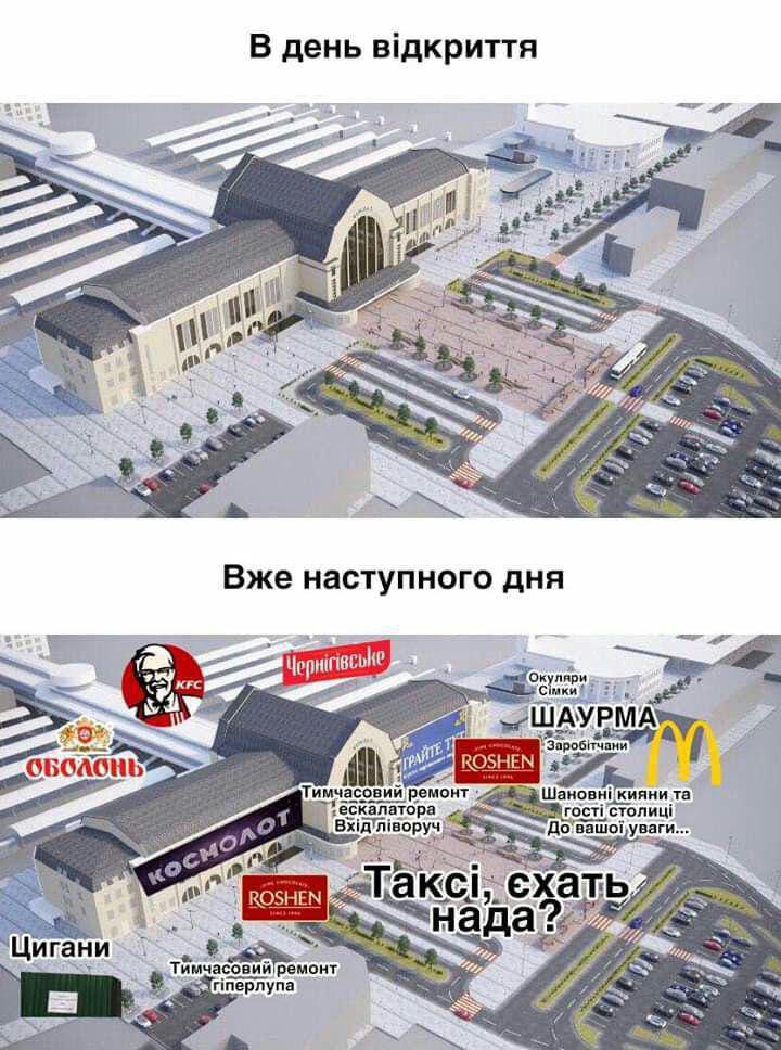 У мережі висміяли ініціативу голови яскравою фотожаби, на якій мальовничо описано, як насправді буде виглядати вокзал, незважаючи на реконструкцію.