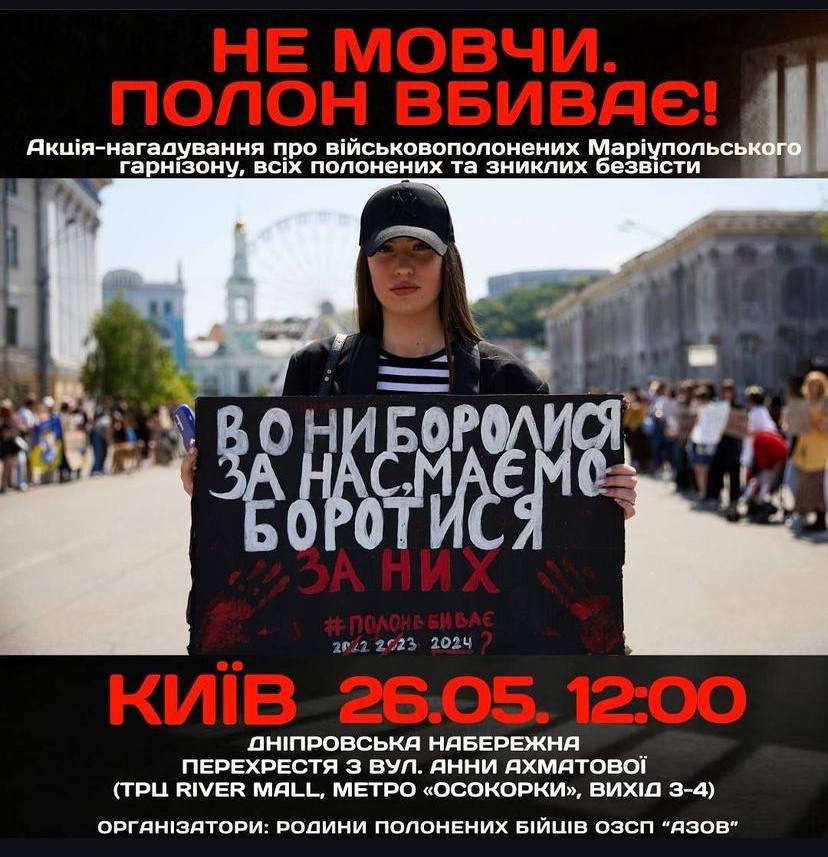 В Києві на Дніпровській набережній проходить акція "Не мовчи – полон вбиває", яка розпочалась 26 травня о 12:00. Мета акції – нагадати всьому світу про полонених українських військових та зниклих безвісти.