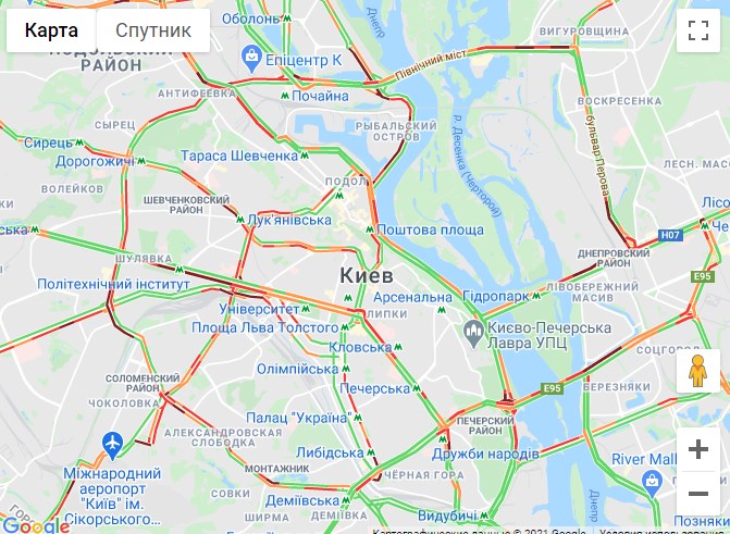 Традиційно в столиці складніше проїхати на мостах через Дніпро. Також рух ускладнений на проспекті Перемоги, Кільцевій дорозі, в центрі. Затори утворилися на в'їзд до Києва по Одеській, Варшавській, Бориспільській та Броварській трасах.