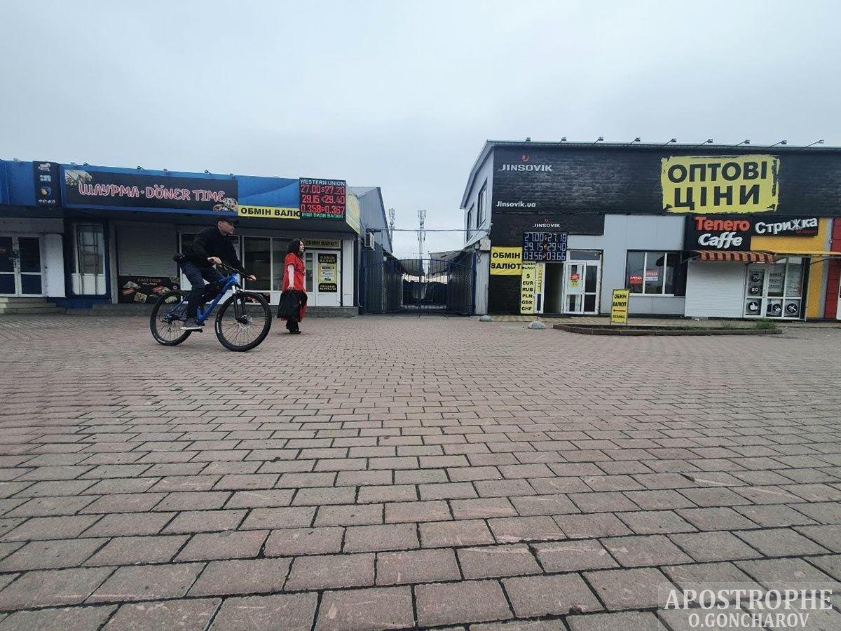 На ринку на вулиці Героїв Дніпра також жвава торгівля не ведеться. Ворота зачинені, павільйони не працюють, на території видно тільки підсобних робітників, які займаються прибиранням.