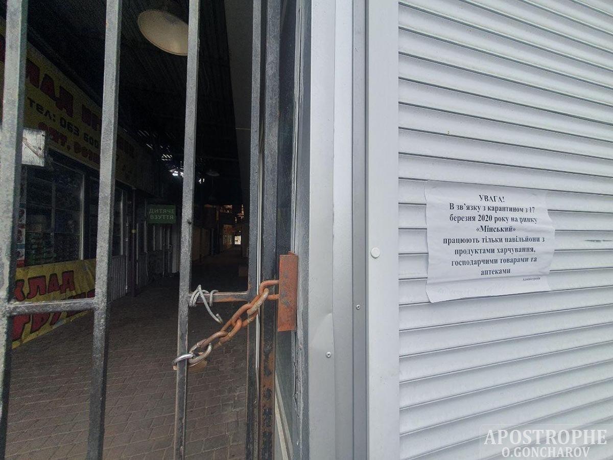 Вхід на ринок "Мінський" все ще закритий. Старе оголошення сповіщає про те, що з 17 березня працюють тільки павільйони з продуктами, господарськими товарами та ліками.