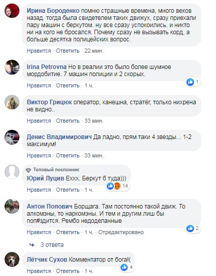 "Але в реалії це був більш гучний мордобій. 7 машин поліції і 2 "швидких", "Борщага. Там постійно такий рух. То алкомени, то наркомени. І тим і іншим аби ***. Рембо незавершені", "Пам'ятаю страшні часи , багато століть назад, тоді була свідком таких двіжух, відразу приїхали пару машин з беркутом. Всі відразу заспокоїлися. і ніхто ні на кого не кидався. Чому відразу не викликати корд, а більше десятка поліцейських питання", - пишуть в коментарях.