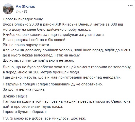 "Вчора (15 лютого - "Апостроф") близько 23.30 в районі ЖК "Київська Венеція" метрів за 300 від мого будинку на мене була спроба нападу. Якийсь чоловік схопив за обличчя і спробував заткнути рота. Я заверещала і побігла в бік людей", - розповіла вона.