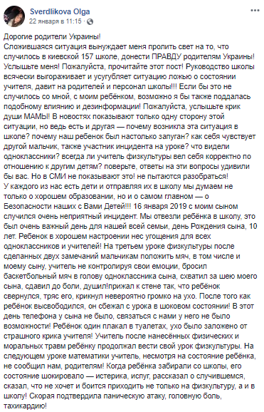 "На третьому уроці фізкультури після зроблених двох зауважень хлопчикам покласти м'яч, в тому числі і моєму синові, учитель не контролюючи свої емоції, кинув баскетбольний м'яч в голову однокласника сина, схопив за шию мого сина, здавив до болю, душив! Притиснув до стіни так, що дитина згорнулася, тряс його, крикнув неймовірно голосно на вухо", - повідомила жінка.