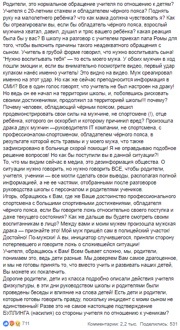 "Учитель в грубій формі говорив, що потрібно виховувати сина! "Потрібно виховувати тебе" - тобто мого чоловіка. У обох чоловіків в хід пішли емоції і, якщо ви уважно подивитеся відео, перший удар кулаком завдав саме вчитель! Це видно на відео. Чоловік зреагував саме на цей удар", - йдеться в повідомленні.