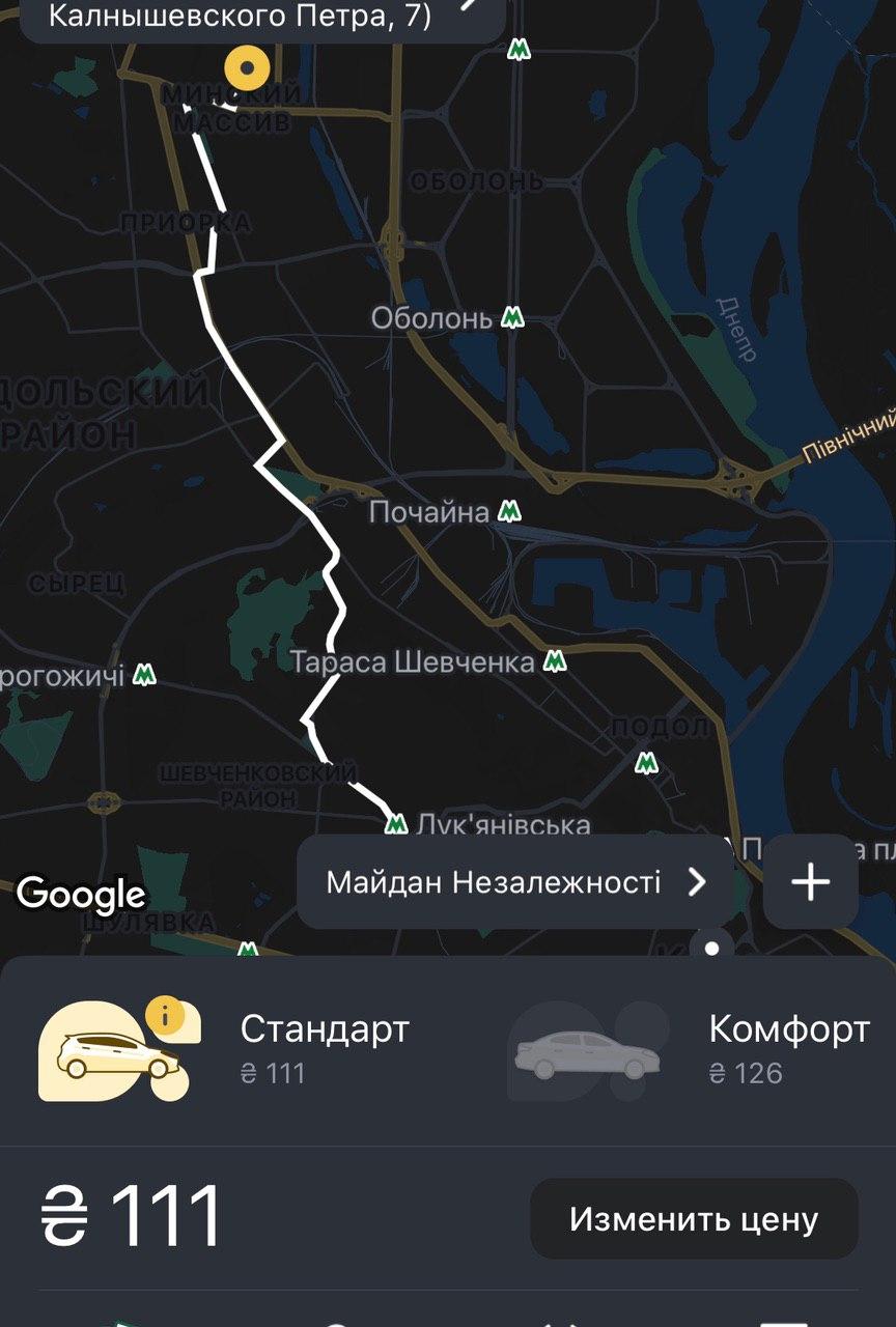 З Мінського масиву в центр міста (Майдан Незалежності) можна дістатися за 120 гривень, схожі ціни і на маршрути з відокремлених районів Лівого берега, наприклад, Троєщини та Воскресенки.