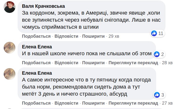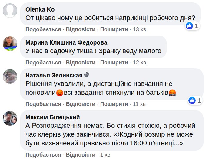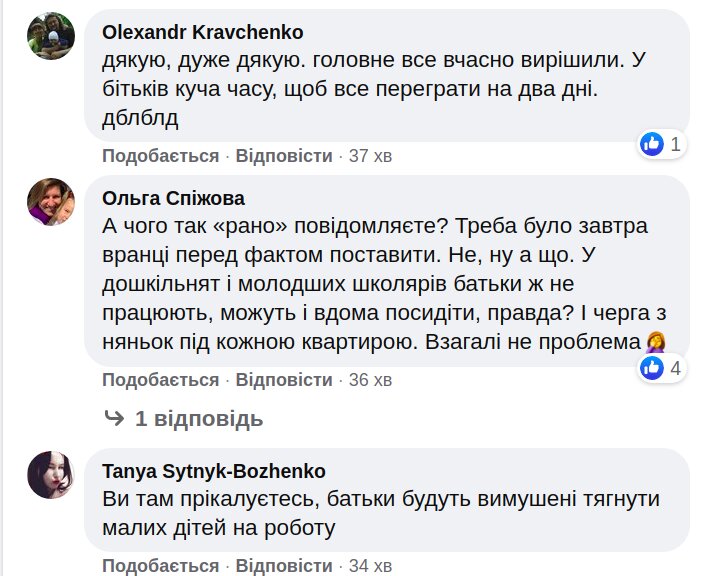 Багатьох батьків така новина засмутила. Вони пишуть, що про це треба було повідомити заздалегідь, а не посеред робочого тижня. Інші підкреслюють, що в їхньому навчальному або дошкільному закладі не попередили про закриття.