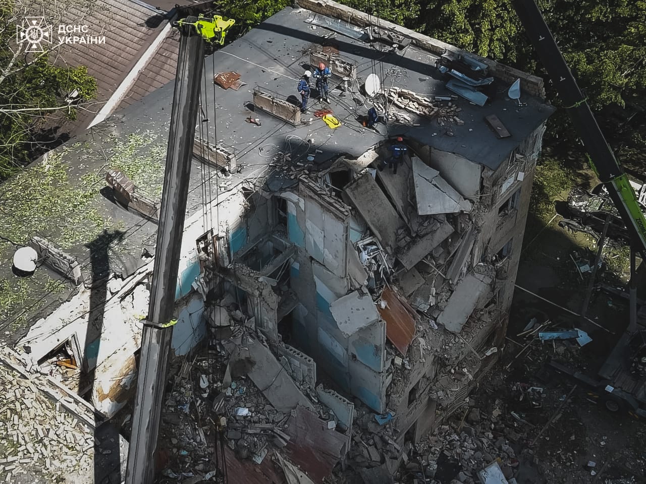Рятувальники продовжують розбирати пошкоджені конструкції, шукають та деблокують тіла загиблих.