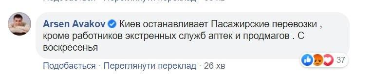 "Київ зупиняє пасажирські перевезення, крім працівників екстрених служб аптек і продмагів. З неділі", - написав Аваков.