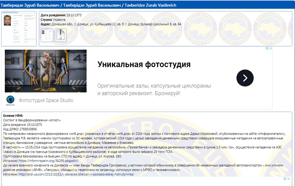 Також дані про цю особу містяться на сайті "Миротворець". Відзначається, що Тавберідзе був учасником бандформування "Оплот" на окупованому Донбасі.