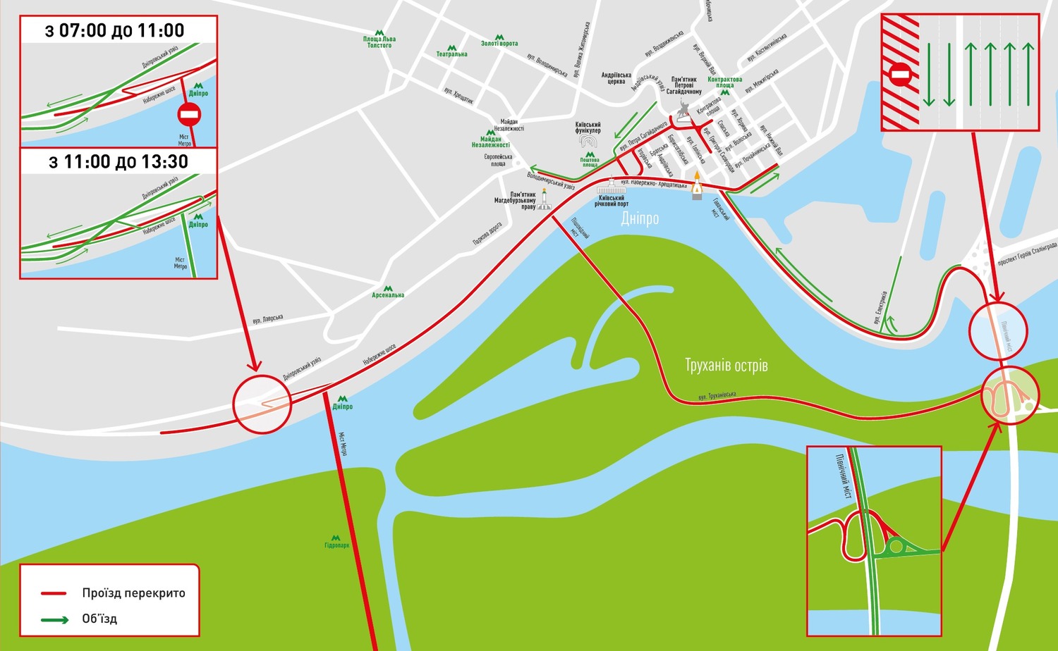 - вул. Набережно-Хрещатицька (у напрямку Гаванського мосту) – із 07:00 до 11:00;