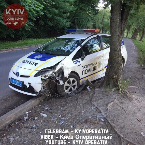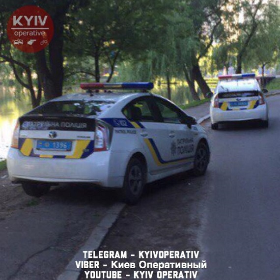 У Києві неподалік від першого озера в Голосіївському парку перехожі помітили автомобіль патрульної поліції Toyota Prius. Передня частина машини з боку водія розбита.
