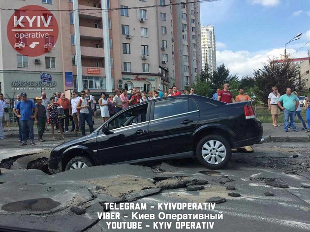 У Солом'янському районі Києва автомобіль марки Opel з дітьми в салоні практично повністю пішов під землю. Інцидент стався на перехресті вулиць Лебедєва-Кумача і Яблонської.