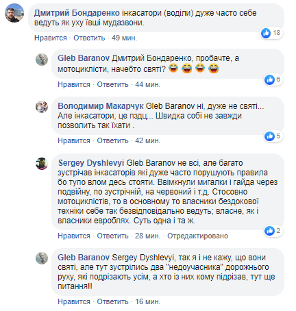 "Інкасатори (воділи) дуже часто себе ведуть як уху ївші мудазвони", "пробачте, а мотоциклісти, начебто святі?", "ні, дуже не святі... Але інкасатори, це пздц... Швидка собі не завжди позволить так їхати", "не всі, але багато зустрічав інкасаторів які дуже часто порушують правила бо тупо влом десь стояти. Ввімкнули мигалки і гайда через подвійну, по зустрічній, на червоний і т.д. Стосовно мотоциклістів, то в основному то власники бездокової техніки себе так безвідповідально ведуть; власне, як і власники евроблях. Суть одна і та ж", "Вони один одного варті.що мотоцикл.що інкасатор", - пишуть коментатори.