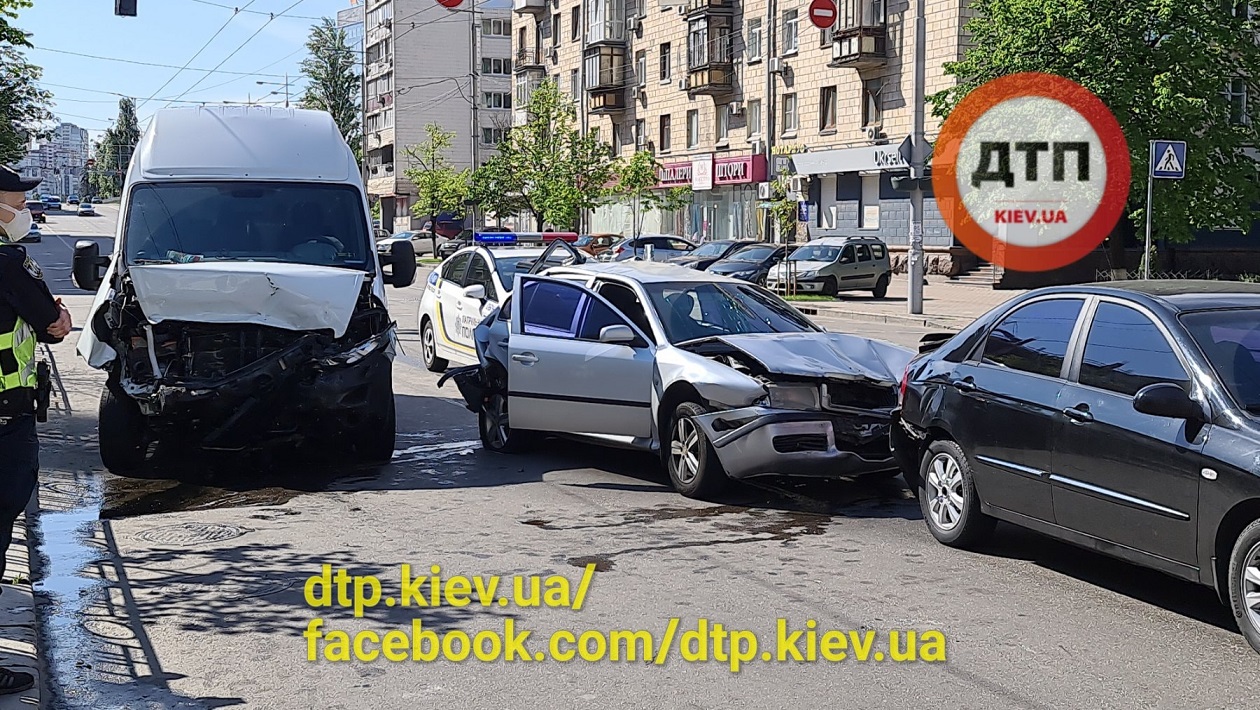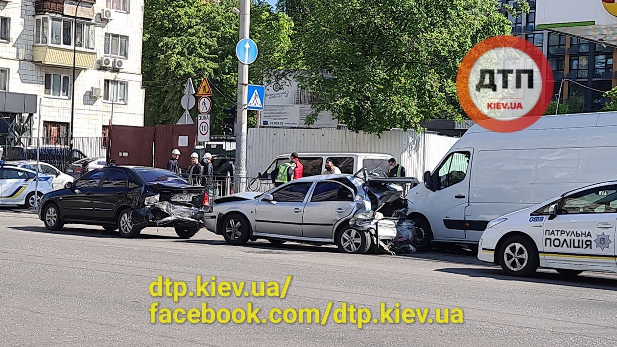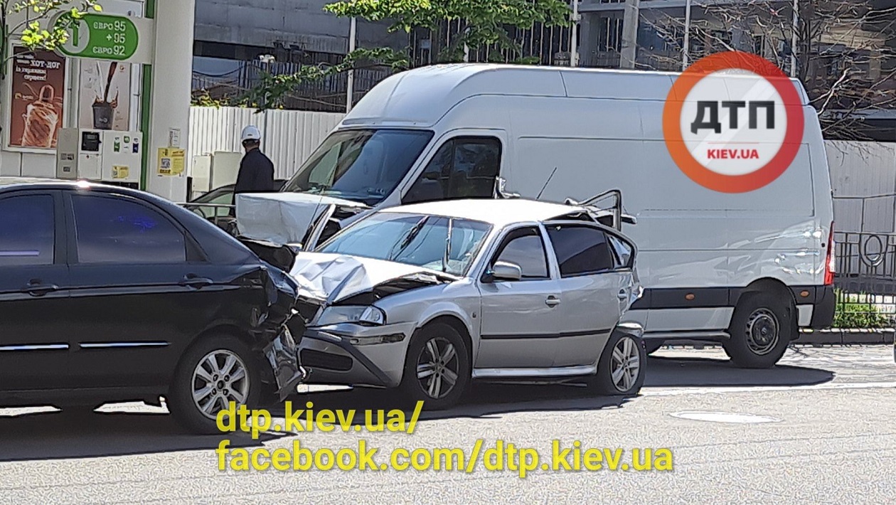 В понеділок, 11 травня, біля автозаправної станції на вулиці Великій Василівській в столиці сталася масштабна ДТП. Водій мікроавтобуса "Опель" врізався в автомобілі, що стояли на світлофорі.