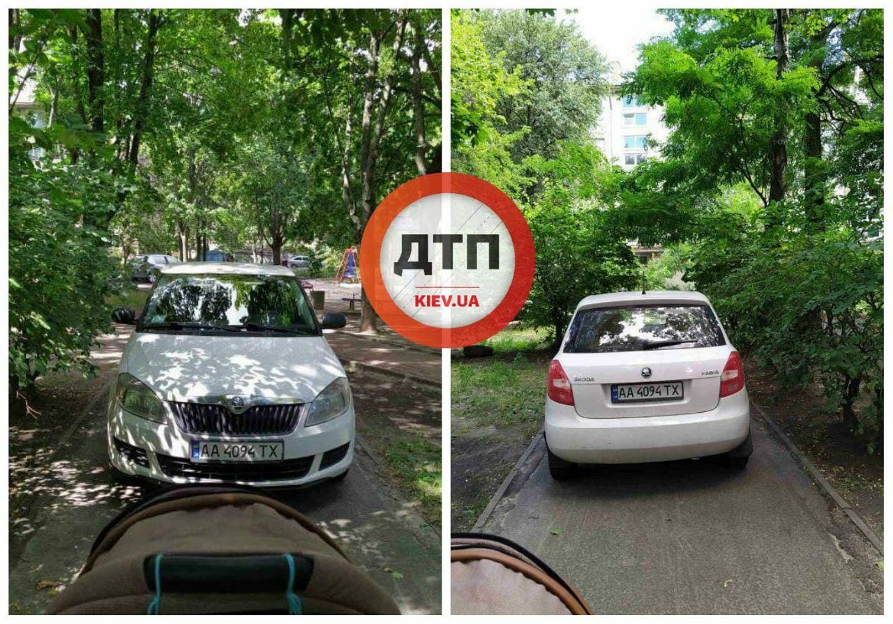 У мікрорайоні Нивки української столиці власник автомобіля Skoda Fabia дратує сусідів паркуванням в недозволених місцях, знищуючи зелену зону біля житлових будинків і перегороджуючи прохід по пішохідних доріжках.
