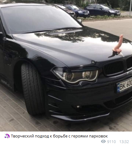 В столиці нахабному "герою парковки", який припаркував своє авто в недозволеному місці, серед тротуару, приклеїли на капот фалоімітатор.