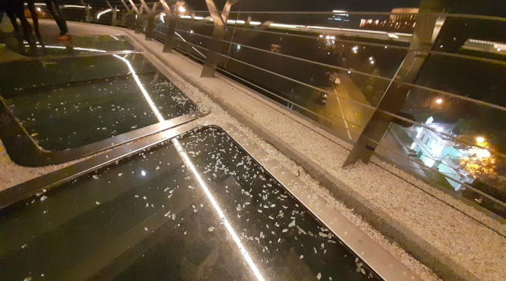 Надзвичайна подія сталася в понеділок, 14 жовтня, пізно ввечері. Очевидці стверджують, що винуватцем інциденту стала маленька дитина. Стоячи під перилами, хлопчик підстрибнув і головою розбив скляну перегородку, що відділяє перила від лампочок підсвічування.