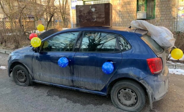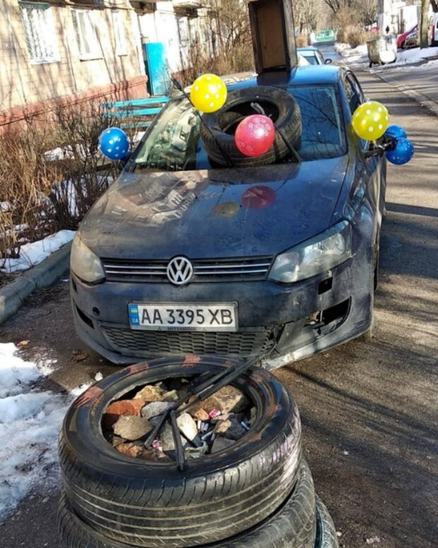 Власник авто, який перегородив своїм автомобілем прохід біля будинку, не раз пошкодує про свій вчинок - ображені пішоходи пробили в його машині колеса, на лобове скло поклали шину, а сам автомобіль "прикрасили" сміттям і повітряними кульками.