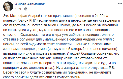 Він представився, що його звуть Метрофан Андрій. Стало відомо, що днем раніше його вже забирала поліція, проте відпустила. "Жертви" неадеквату вирішили ще раз написати заяву.