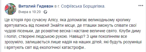 "Це історія про сучасну Алісу, яка допомагає великодньому кролику врятуватися від пожежі! Знайти місце, де пташки зможуть співати свої чудові пісеньки, де розквітне весна і настане велике свято. Клуби диму і попелу, створені людською рукою. Навіщо?", - пише автор муралу.