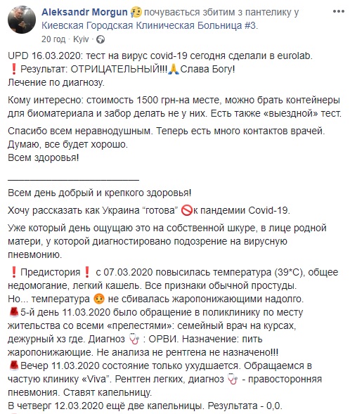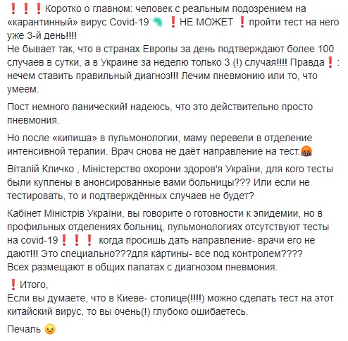 "Коротко про головне: людина з реальним підозрою на "карантинний" вірус Covid-19 не може пройти тест на нього вже 3-й день!!!! Якщо ви думаєте, що в Києві столиці (!!!!) можна зробити тест на цей китайський вірус, то ви дуже (!) глибоко помиляєтеся", - зауважив син пацієнтки.