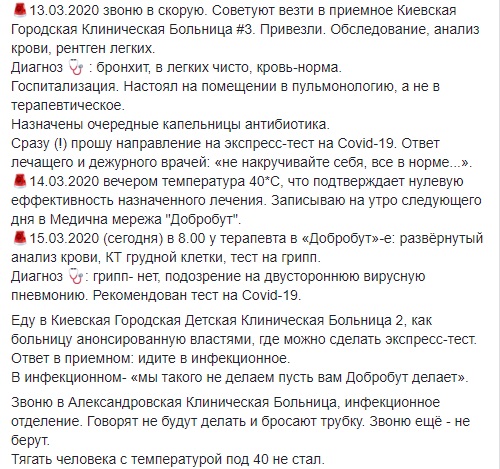 За словами жителя Києва, у його матері було діагностовано підозрау на вірусну пневмонію після того, як 7 березня в неї підвищилася температура, з'явився кашель і загальна слабкість. Після госпіталізації він попросив у лікарів скерування на експрес-тест на Covid-19, проте вони лише порадили "не накручувати себе".