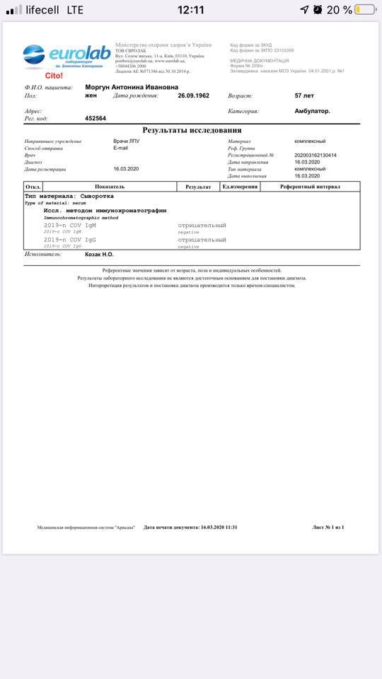 В кінці-кінців тест на вірус Сovid-19 зробили в понеділок, 16 березня, в мережі Eurolab. Результат, на щастя, виявився негативним.