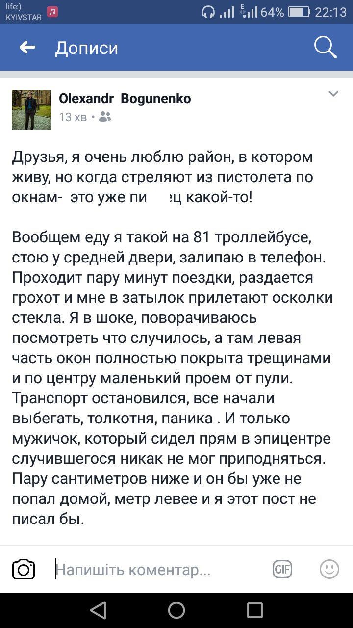 За його словами, в результаті стрілянини в тролейбусі 81-го маршруту (як пізніше уточнив "Апостроф", мова йде про автобус №81) було вибито одне з вікон.