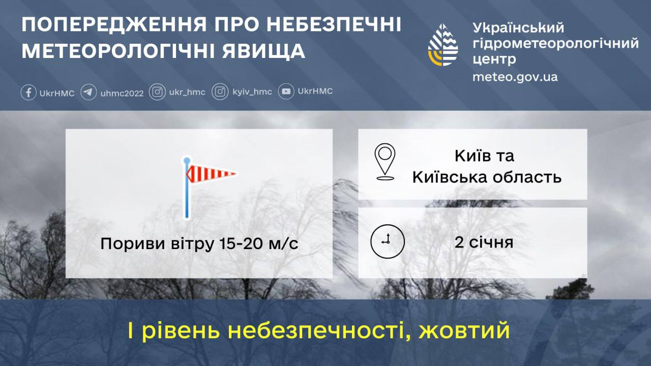 Так, за прогнозами Українського гідрометцентру завтра, 2 січня в столиці вируватиме сильний вітер, його пориви будуть сягати 15-20 м/с. У зв"язку зі складними погодними умовами, оголошено І рівень небезпечності.