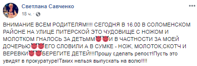 "Увага всім батькам!!!! Сьогодні о 16.00 в Солом'янському районі на вулиці пітерської це чудовисько з ножем і молотком гнався за дітьми і зокрема за моєю дочкою. Його зловили а в сумці - ніж, молоток, скотч і мотузки! Бережіть дітей!!! Прошу зробити репост! Нехай це побачать в прокуратурі! Таких не можна випускати на волю!!!! ", - йдеться в повідомленні.