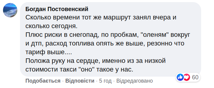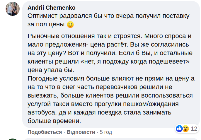 "Вчора в цей же час я замовляв продукцію ATA-gear з Борщагівки на Солом'янку. Це коштувало 102 грн глухонімому водієві. Сьогодні. Через добу. Сніг. Довозять передачу. За 212 грн", - написав Молчанов.