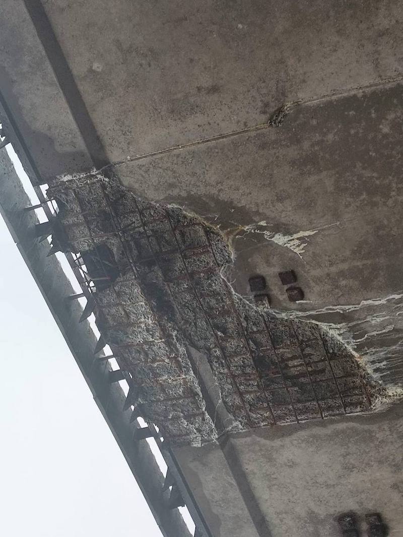 На фото видно, що шматки захисного бетонного шару поступово відвалюються, залишаючи оголені залізні прути.