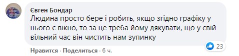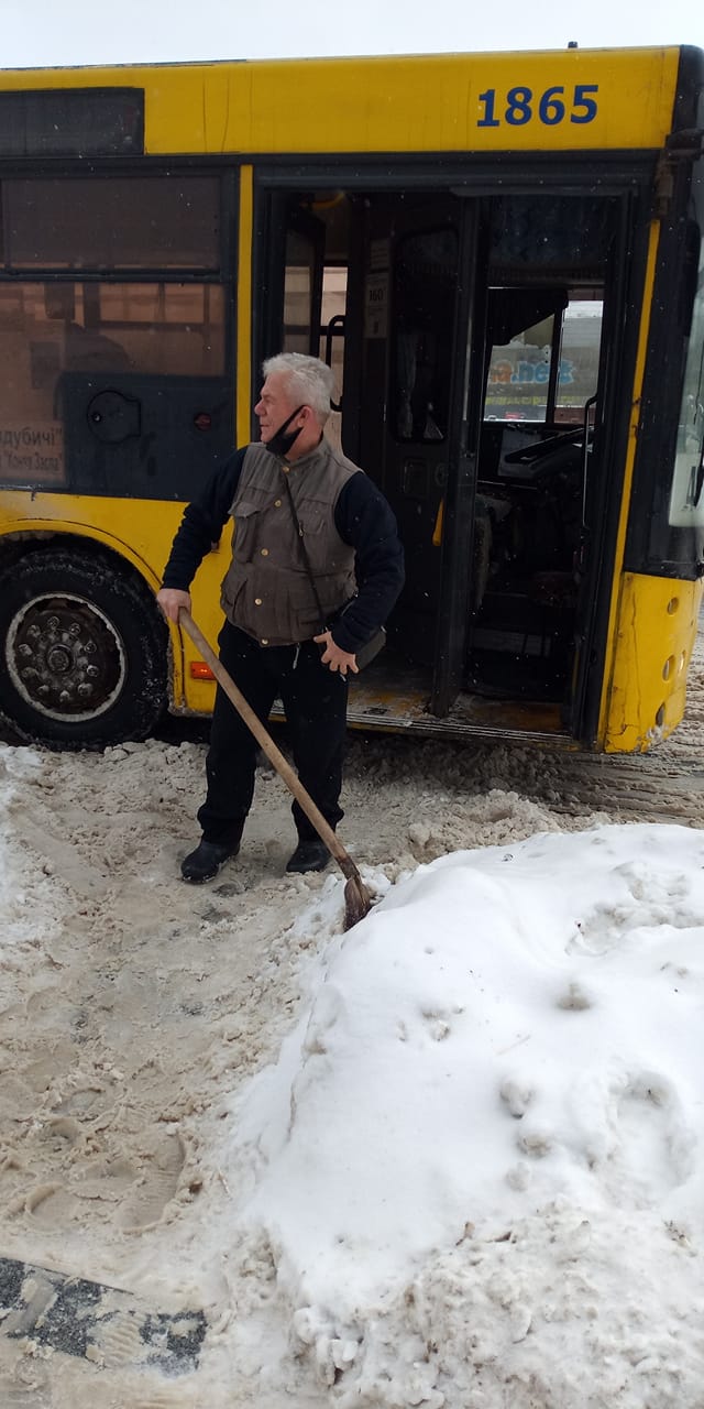 Так, біля станції метро "Видубичі" помітили водія автобуса 43К. Він вирішив зробити благородний вчинок і, під'їхавши на зупинку, сам взяв лопату і почав розчищати доріжки для пасажирів.