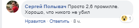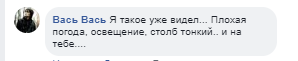 "Синька перемогла!", "Я таке вже бачив... Погана погода, освітлення, стовп тонкий. І на тобі", "Просто 2,6 проміле. Добре, що нікого не вбив", "Не, ну ці стовпи розперезалися, стоять де попало. Заважають людям їздити, як хочеться", "Дивлячись, хто був за кермом, якщо дитя чиновника, то стовп сам підбіг, а якщо вчитель із середньої школи, то звідки у нього Мерседес?", "Добре ще, що в стовп", - пишуть коментатори.