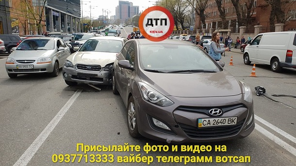 На вулиці Льва Толстого водій автомобіля Audi на швидкості вилетів на зустрічну смугу, протаранив Volkswagen, а потім ударив Subaru і Hyundai.