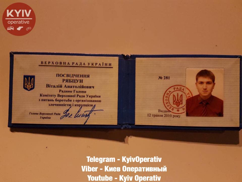Тоді один з молодих людей, який був за кермом, пересів на пасажирське сидіння автомобіля. Також він почав погрожувати і грубіянити поліцейським, пред'явивши посвідчення радника голови Комітету Верховної Ради з питань боротьби з організованою злочинністю і корупцією, видане на ім'я Рябцун Віталій.
