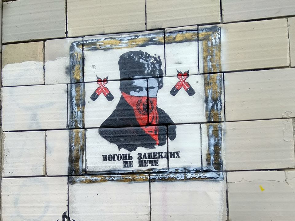 Малюнки, які зображують відомих українських письменників в образі революціонерів, були заново нанесені на колишніх місцях.