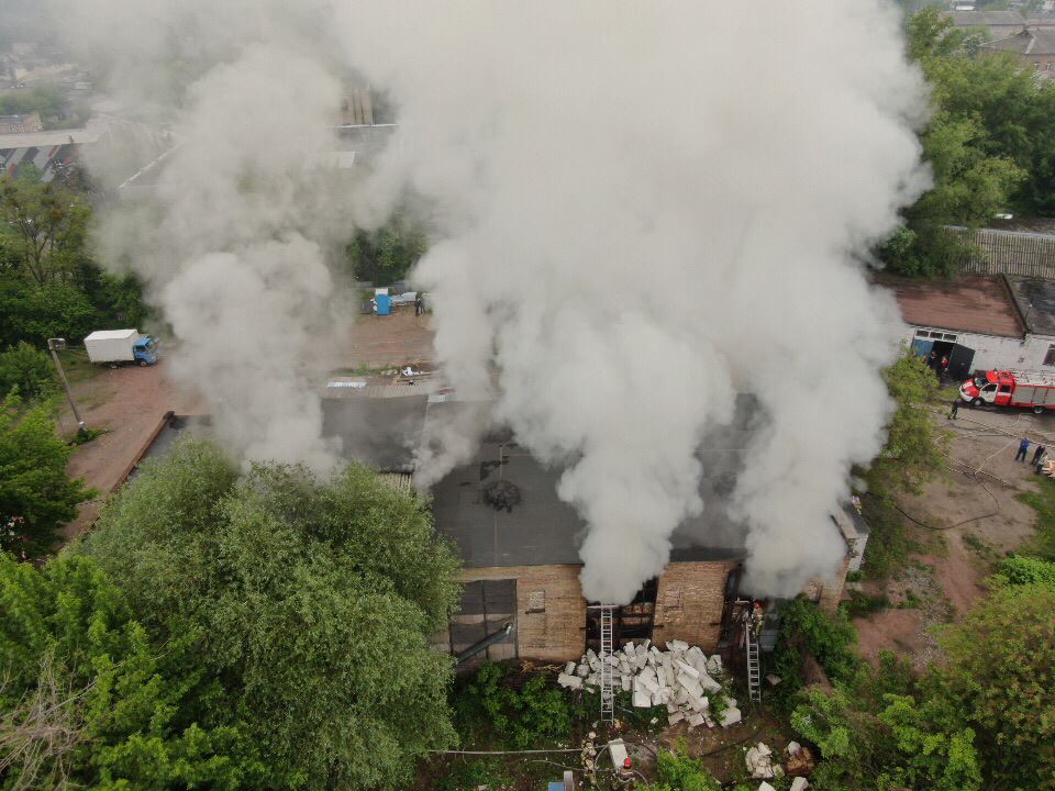 Пожежа почалася в цеху дизайнерських виробів. Над будівлею стоїть величезний стовп диму. На місце оперативно прибули рятувальники, пожежі присвоїли підвищений ранг складності через те, що, крім меблів, всередині знаходилися каністри з паливом і маслом, а також газові та кисневі балони.