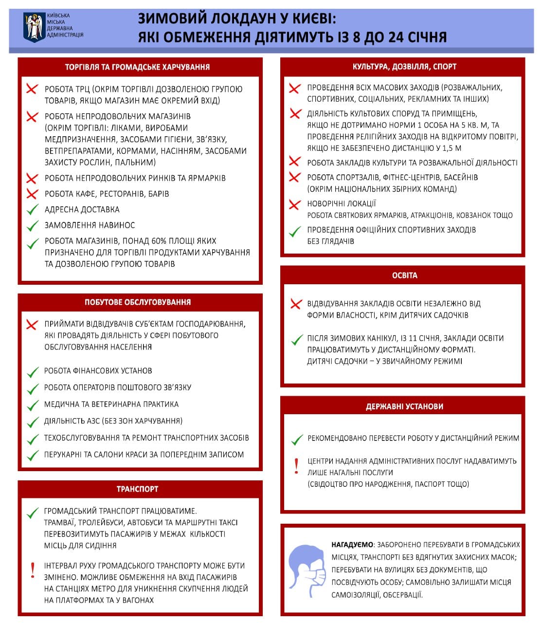 З 8 до 24 січня забороняється проведення всіх масових заходів, а також прийом відвідувачів в установах культури та інших установах розважальної діяльності.