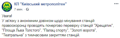 "У зв'язку з анонімним дзвінком щодо мінування станцій правоохоронці проводять почергово перевірку станцій "Хрещатик", "Площа Льва Толстого", "Палац спорту", "Золоті ворота", "Театральна" з тимчасовим закриттям станцій", - йдеться в повідомленні.