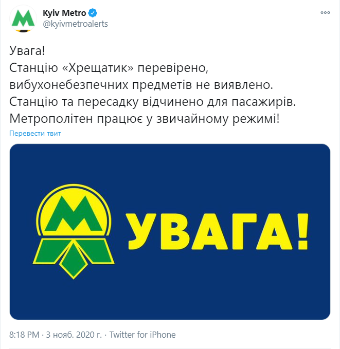 "Станцію "Хрещатик" перевірено, вибухонебезпечних предметів не виявлено. Станцію та пересадку відчинено для пасажирів. Метрополітен працює у звичайному режимі!", - повідомили в адміністрації Київського метрополітену у Twitter.