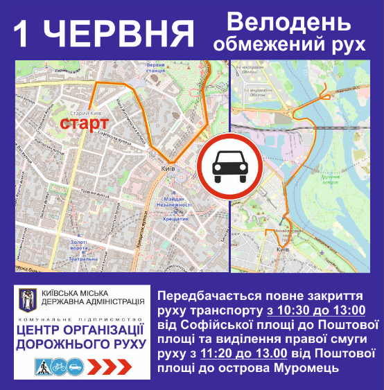 З 11:20 до 13:30 - планується обмеження руху автотранспорту без повного перекриття і з виділенням правої смуги для проїзду велосипедистів за маршрутом: площа - вул. Набережно-Хрещатицька - Гаванський міст - вул. Набережно-Рибальська - Північний міст - вул. Трухановская - Парк "Муромець" (фініш).
