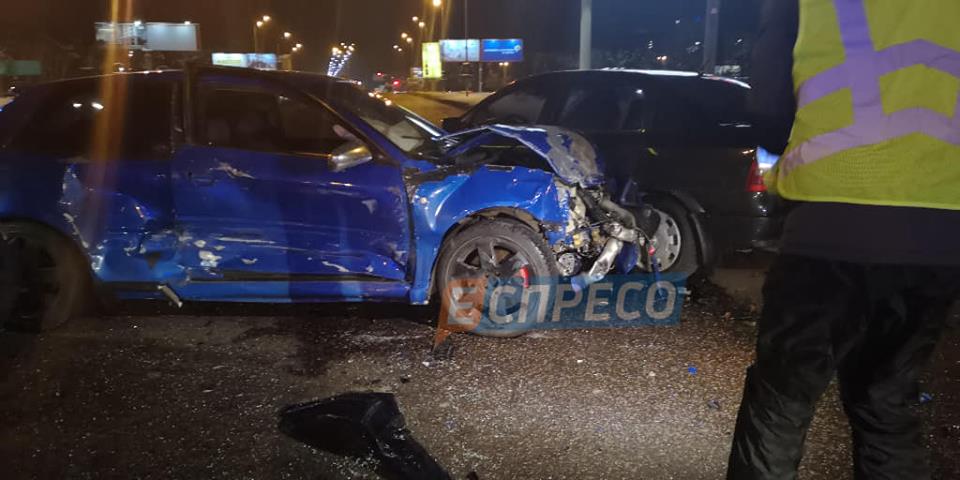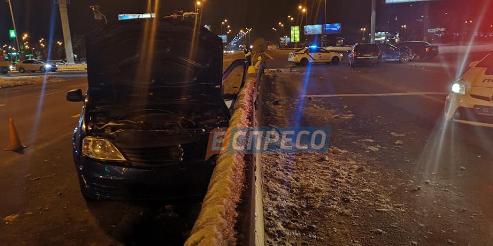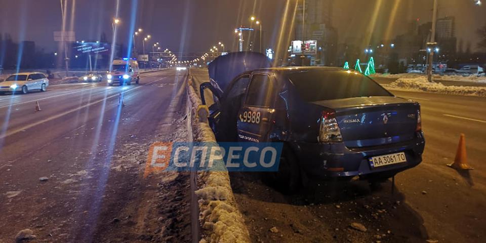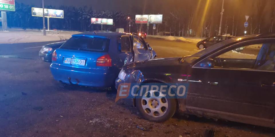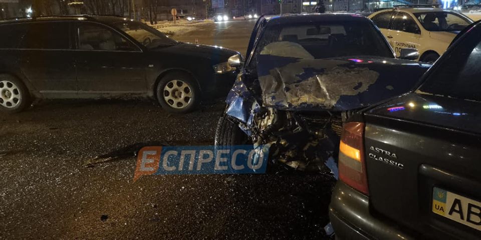 "За словами свідків події - автомобіль таксі Renault виїхав з боку Харківського шосе на кругове перехрестя, начебто, на заборонний сигнал світлофора і протаранив в правий бік Audi A3, який рухався з Бориспільського шосе. Від удару Audi A3 відкинуло на Audi A6 і Opel. водій таксі від удару вилетів з автомобіля на дорогу", - сказано в повідомленні.