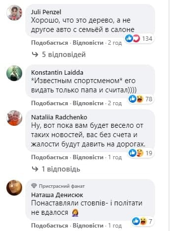 "Понаставляли стовпів - і політати не вдалося", "Добре, що це дерево, а не інше авто з родиною в салоні", "Відомим спортсменом, його, мабуть, тільки тато і вважав", - пишуть вони.