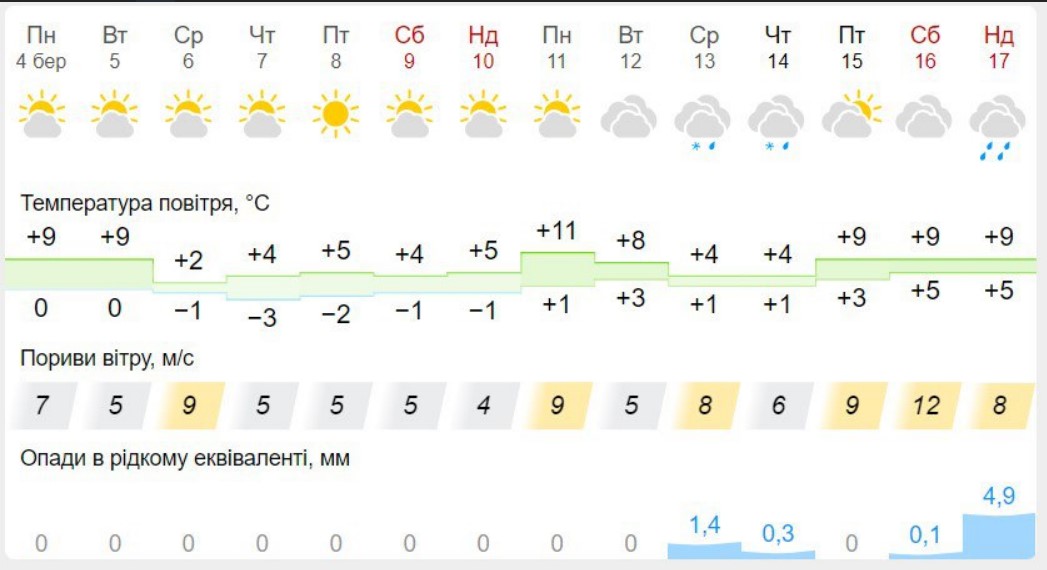 Середина березня буде відносно теплою – 15 березня вдень очікується до +9, уночі термометри почнуть неухильно підніматися нагору та покажуть +3- +5. У цей день без істотних опадів, а 17 березня можливий невеликий дощ.