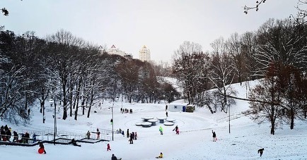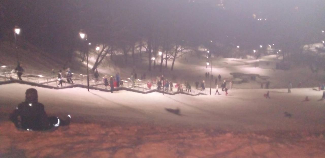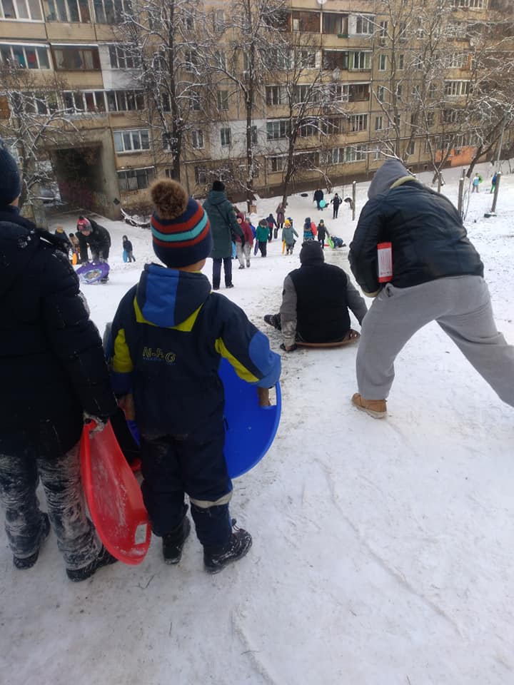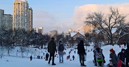 Кияни вже навіть встигли прозвати свої снігові гірки Солом'янським Буковелем. На вулицях натовпи дорослих та дітей, які із задоволенням з'їжджають зі схилів на різного виду санках.